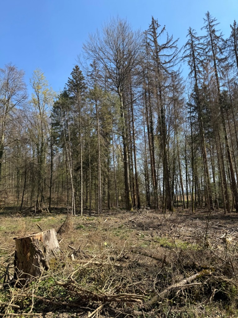 В июне 2016 Басадинген получил приз за самый красивый смешанный лес Швейцарии. Пару лет спустя этот лес был почти полностью уничтожен короедами. Не успел он начать восстанавливаться, как его добили паразиты, которых кто-то умудрился завезти из Юго-Восточной Азии. Избавиться от паразитов можно было одним способом — сжигать пострадавшие деревья. Результат: на возрождение леса уйдут десятилетия. А пока он выглядит вот так: