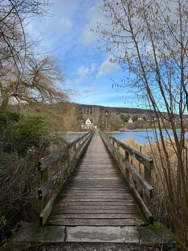 Eschenz, January 2025 — мост ведёт к острову Верд, главному острову архипелага Im Werd в западной части Untersee (Bodensee). «Werd» на устаревшем немецком — «остров». Значение «Werd» исчезло в 16 веке, а само слово осталось лишь названием.